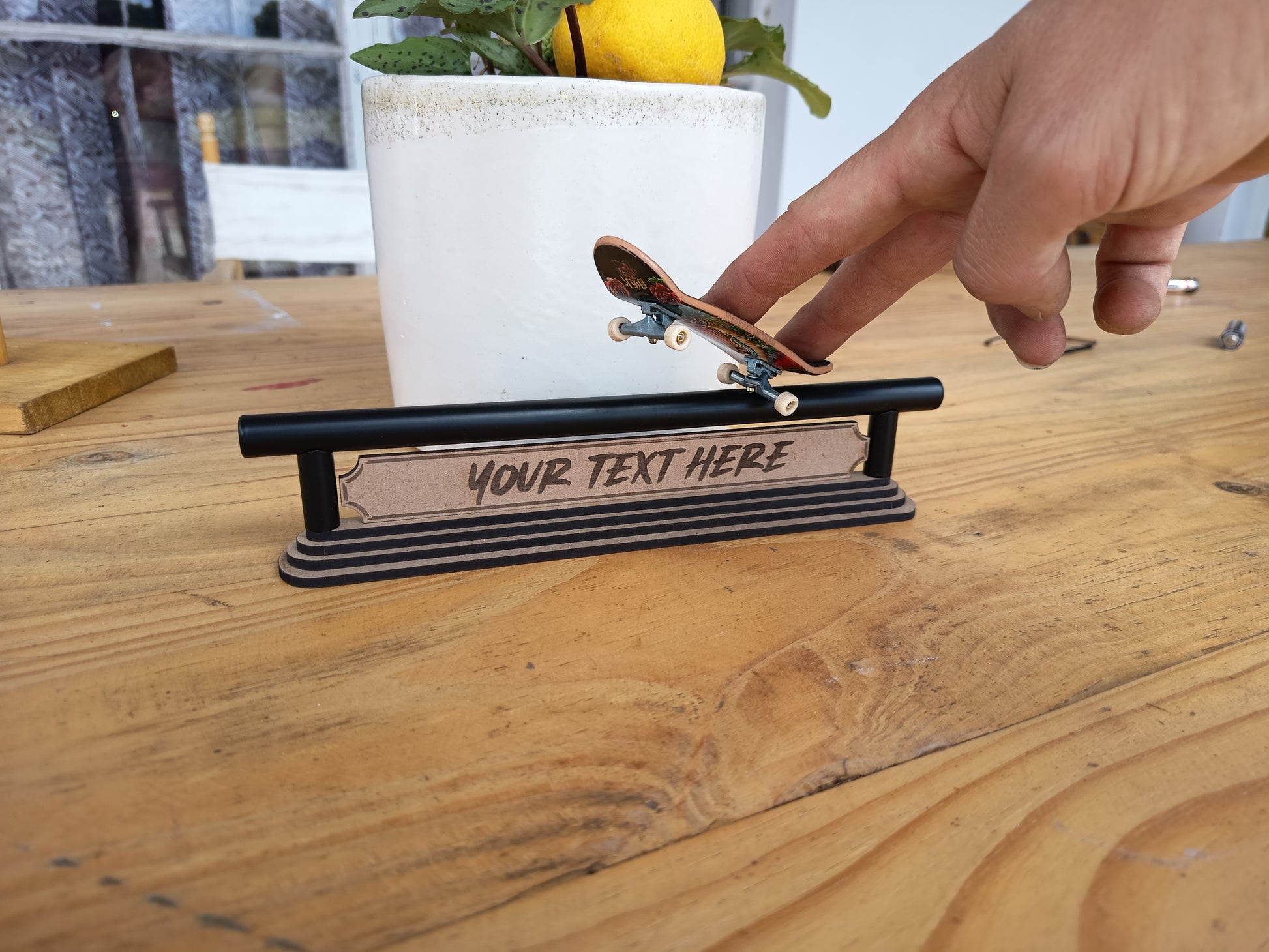 This mini grind rail is built from a real metal drawer handle mounted to a precision laser-cut MDF base. It’s stable, smooth, and ready for slides, grinds, and manuals.
